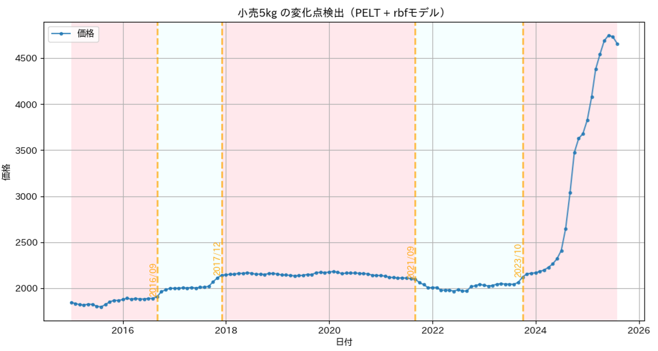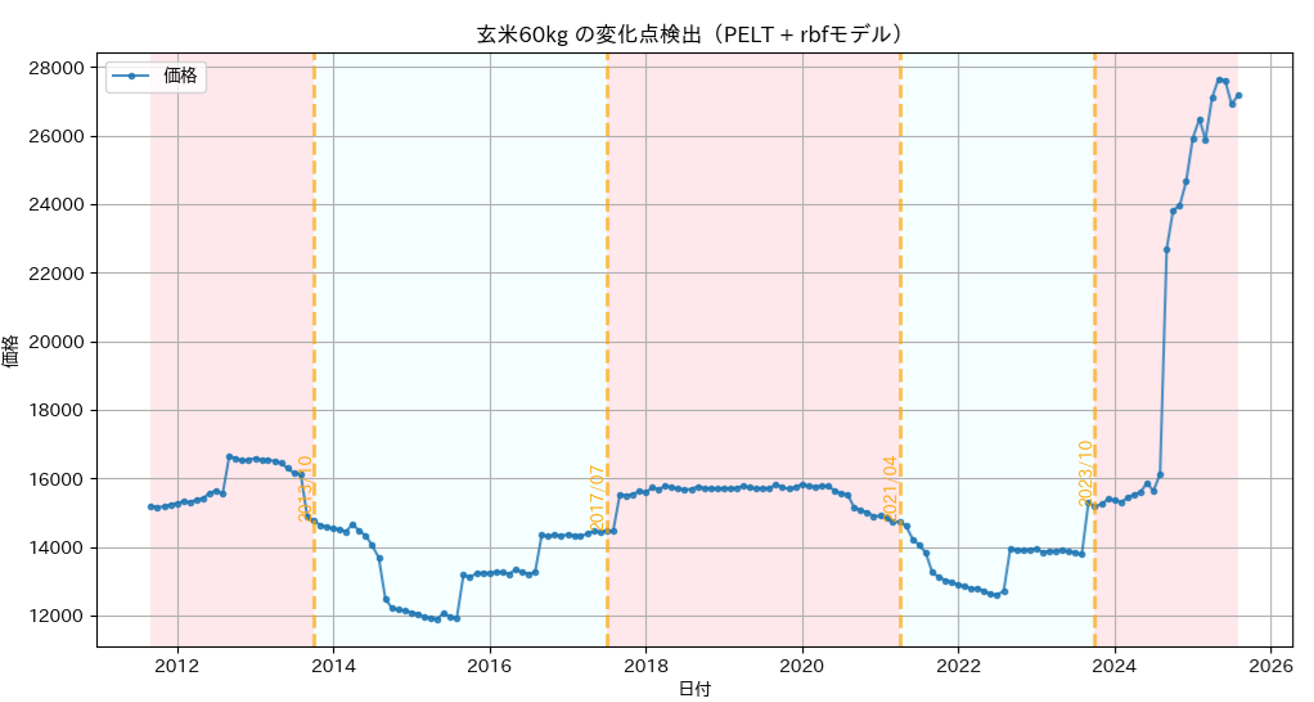 Pythonのrupturesライブラリを用いて、変化点検出ができるか試してみます。今回はこのライブラリの中のPELTアルゴリズムを使いました。これは時系列データの中で統計的性質が変化する点を検出するもので、その中でも分布の変化を対象にするRBFモデルを用いました。ペナルティのパラメータ(= pen)はpen = 8に調整しました。