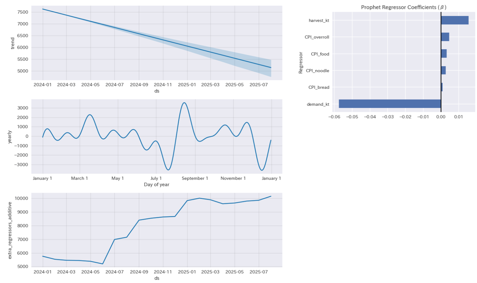 全体的なトレンドは価格減少方向を見出し、外生要因で上昇圧力を示したようです。9月の新米の時期と春先に価格が上がりやすいという季節性はうまく見出せたようです。