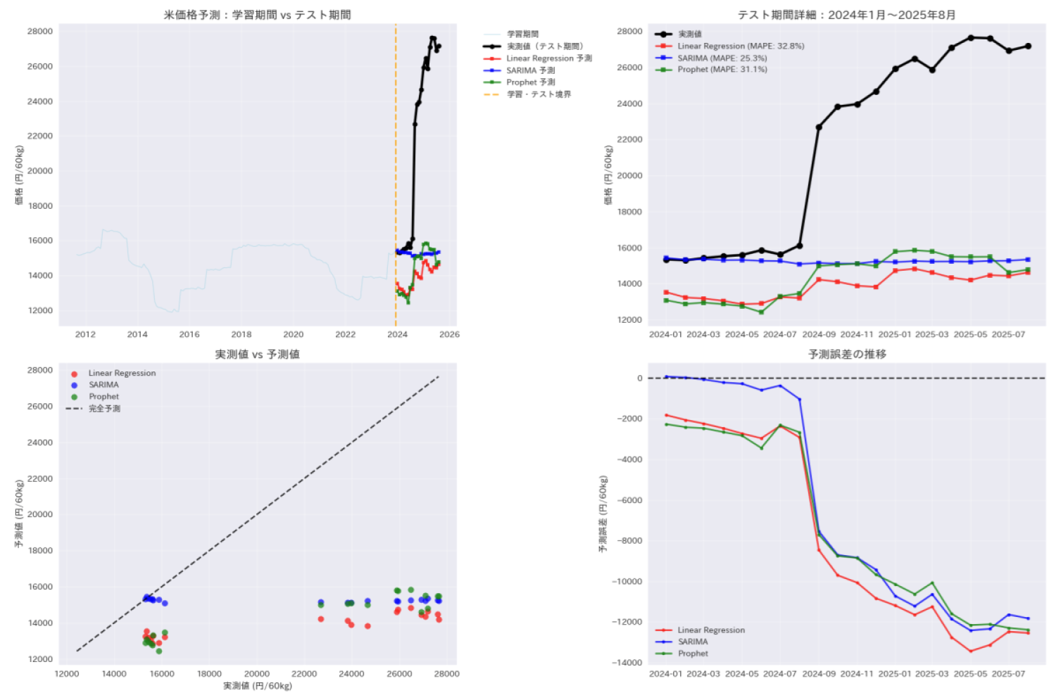 グラフに表示した結果を見ると、2023年頃までは3モデルとも実測に比較的うまくついて行っているようです。価格上昇が始まると、重回帰やProphetは過小ではあるもののなんとか上昇方向に予測しているようです。SARIMAは横ばいに近く、その後も下がる方向を予測し、ここで大きく外していそうです。右下のヒストグラムで見ると、SARIMAは誤差のかなり小さい領域に集まりますが、左の裾は長くなっています。ProphetはSARIMAより裾は狭いですが、右方向(過大)にも広がりがあります。重回帰モデルは広く散らばりました。