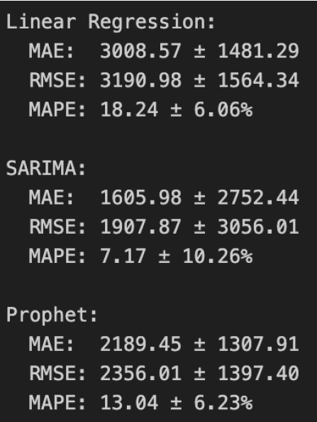 これがスコアとしての結果(±は標準偏差)で、SARIMAが最も良い数値ですが、ばらつきは大きいというものでした。