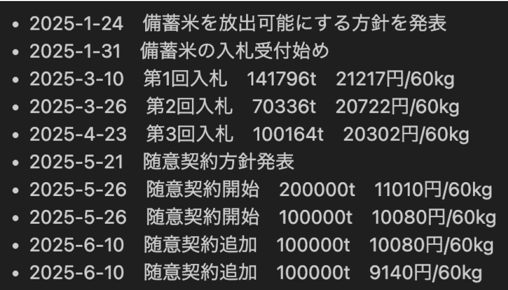 また、備蓄米の放出量や日時については新聞や農林水産省のHPを元にデータを得て、分析はPython3.12.7の環境で行いました。