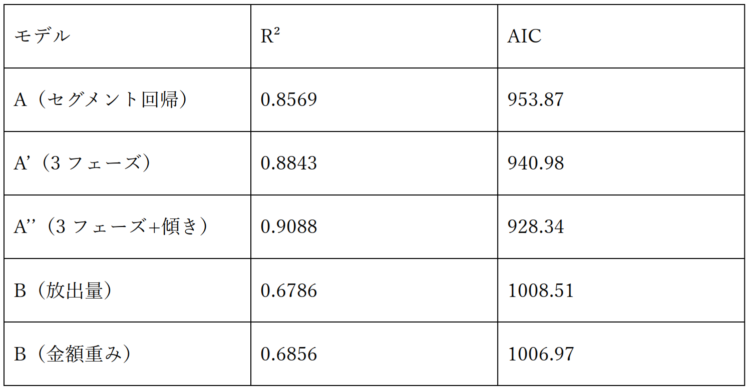 5つのモデルを構築してみましたが、決定係数やAICを見るとモデルA’’(3フェーズでの傾き変化を組み込んだ回帰)が最も当てはまりのいい結果でした。