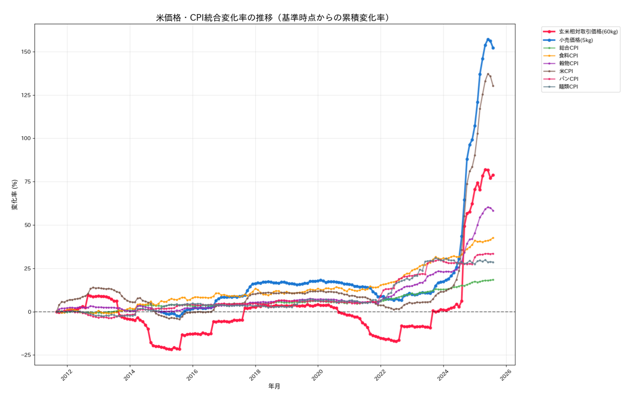 見たところ2024年半ばくらいから急上昇しています。相対取引価格についていうと、9月から新米が出るのでそのタイミングで価格に変化が生まれてそこからは横ばいというのが高騰が始まる前の基本的な傾向です。
