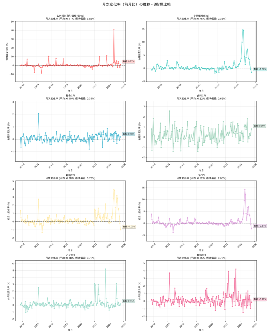 米の小売価格とCPIの変化量は群を抜いているように見えます。